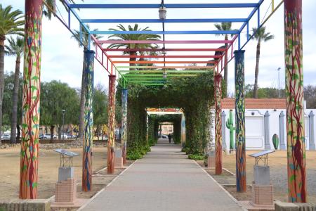Esta interesante y curiosa ruta en el parque Villa Luisa de La Palma del Condado rinden homenaje a la poesía y a diferentes artistas y escritores vinculados a la ciudad y obras de arte en los que se recrea imágenes conocidas por la opinión pública, no solo del municipio condal, sino desde el punto de vista universal: “Guernica”, “El Grito”, simbolismos cervantinos, etc.